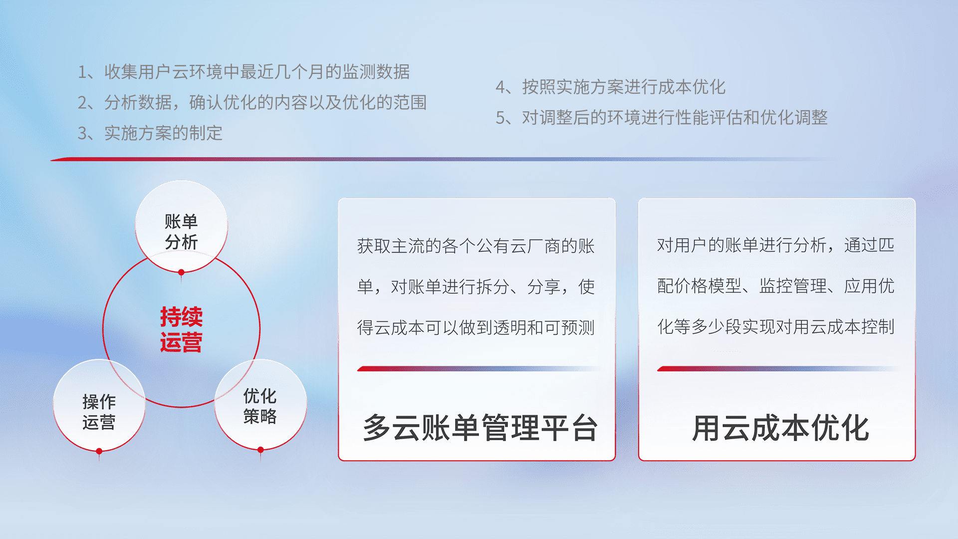 通过多云纳管,,以统一的资源数据模型把客户的云资源进行抽象和封装,,,,进而实现对多云资源的统一操作,,保障云资源管理的可靠性、、稳定性与可用性。。量身定制化运维内容,,,配置、、、、开发运维、、、、补丁管理、、、备份、、、、监控、、认证和访问管理、、、、审计和日常巡检等,,,保障在用云过程中的可靠度,,,稳定度以及高可用率。。。